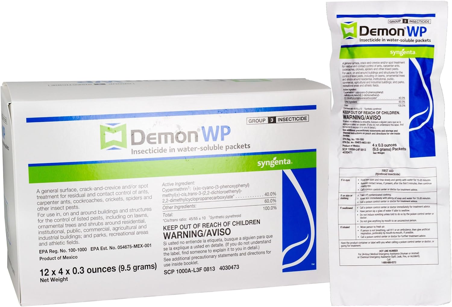 Demon WP Insecticide (1 envelope, 4 water-soluble 9.5g packets, 40% cypermethrin) makes 4 gallons of solution. Ideal for indoor crack-and-crevice and outdoor barrier treatments, it controls ants, roaches, and termites with quick action and lasting residual.